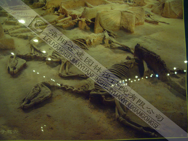 整個(gè)博物館占地1700多平方米,為半地下式建筑,地面高度,3.6米,地下深度5.4米。分為兩個(gè)展區(qū):第一展區(qū)分四個(gè)板塊,一是洛陽地區(qū)5大都城與當(dāng)代洛陽相互位置關(guān)系的圖版;二是東周王城概況;三是王陵的探索與發(fā)現(xiàn);四是珍貴的東周文物。第二展區(qū),東周時(shí)期大型車馬坑展區(qū)。這里展示的是2002-2003年,考古工作者發(fā)掘清理的17座車馬坑(馬坑)中的2座。其中北邊一座,規(guī)模系國內(nèi)少見,其車馬呈縱向兩列的排放,宛如出行陣列的場面,更顯精彩。最令世人矚目的是唯一一輛"駕六"的發(fā)現(xiàn),以直觀清晰的形式印證了古文獻(xiàn)中"天子駕六"的記述,這也是世界上唯一一處原址展示的"天子駕六"。